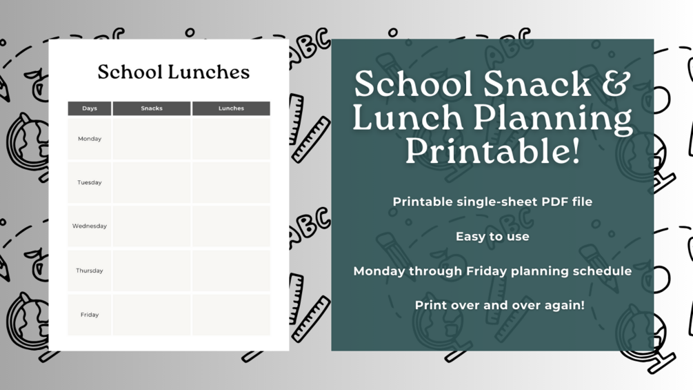 This school lunch and snack meal planning printable is the perfect tool to help parents and guardians plan out healthy and nutritious meals for their children. The printable includes a Monday through Friday schedule plus spaces to write down the meals and snacks for each day.